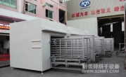 (8)烘干箱內可存放1輛推車。推車配置耐高溫角輪(定向輪、萬向輪各2個),推車里面安裝限位柱用于定位里面托盤,兩側配有L形托架,用于支撐及左右限位托盤。進出口裝有手動爐門。頂部部置循環(huán)風機、蒸氣換熱器等裝置,排廢風機安裝在爐體頂部。